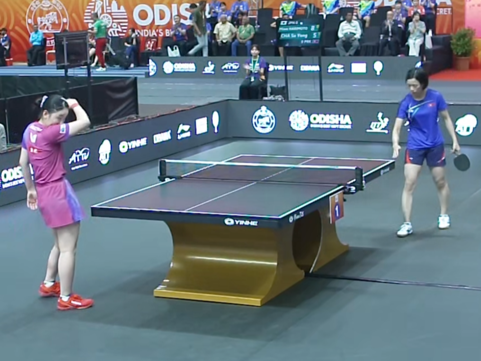 比赛开始后,双方在首局就打得非常激烈,张本美和虽然在相持阶段有优势,但在发接发环节的表现却远不如车秀英,双方鏖战至7-7后逐渐拉开差距,张本美和没有把握住自己的发球轮,同时连续出现吃发球的情况,结果连丢4分以7-11先输一局。